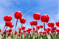 Rode tulpen met close up van onderen gefotografeerd met blauwe lucht in het lente seizoen. Veld met bloeiende rode bloemen met schijnende zon en strak blauwe lucht in Nederland gedurende het voorjaar.