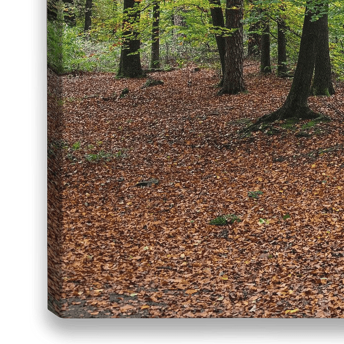 Bomen op de Veluwe in de buurt van de Loenense Waterval bij Loenen tijdens de herfst. De bomen zijn in herfstkleuren, terwijl de bodem bezaaid is met afgevallen bladeren.