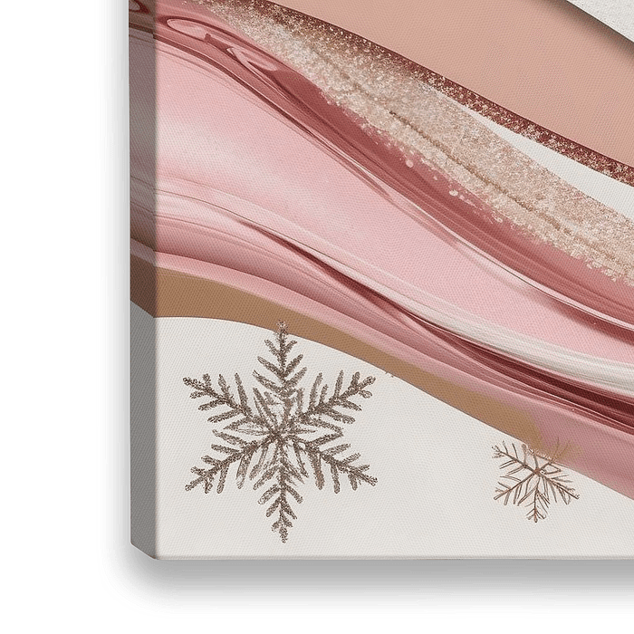 Velvet Frost – A Pinkmas Dream is een elegante dans van kleur, textuur en ritme. Deze digitale kunstprint is opgebouwd uit golvende stroken in blush roze, zacht wit, roségoud en glinsterende champagne tinten, met daartussen ijzige sneeuwvlokken die als kristallen zweven over het beeld. Het werk straalt een serene luxe uit — alsof zijde en glitters samen één fluïde vorm aannemen.