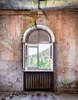 Dit is een foto van een venster dat samen met de muur in hevig verval is. Deze ruimte maakt onderdeel uit van een verlaten school die prachtig ligt in de Italiaanse heuvels. Een klein deel van het uitzicht zie je door het gebroken glas.