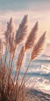 Als zachte veren buigen de pampagrassen zich naar het zachte gezang van de wind. De horizon glanst in zachtroze en lichtgoud, terwijl de zee glinstert in glinsterende vlekken. Een weerspiegeling van de lichtheid van het moment. De grassen zien eruit als dansende silhouetten in het avondlicht. Deze foto verweeft natuurlijke elegantie met…