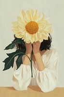 Een poëtische digitale illustratie waarin een figuur in een luchtige witte blouse een grote, romige dahlia voor zich houdt. De compositie speelt met verbergen en onthullen, waarbij de zachte tinten van de bloem contrasteren met het diepgroene blad. Het werk straalt een serene, dromerige sfeer uit die doet denken aan een modern sprookje.