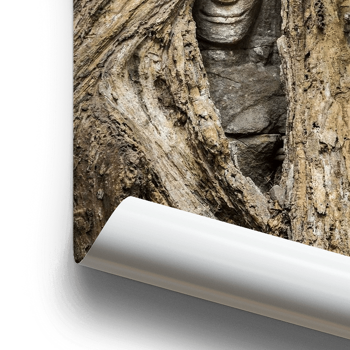Hier zie je door een opening in de boomstam het gezicht van boeddha. Aan het licht gekomen.