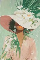Een sierlijk kunstwerk in zachte pasteltinten waar mint groen en roze de boventoon voeren. Een grote witte hoed versierd met delicate bloemen vormt het centrale element. De compositie straalt pure elegantie uit met een vleugje mysterie, versterkt door de subtiele kleuraccenten en verfijnde penseelstreken die een dromerige sfeer creëren.