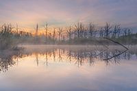 Op een vroege mistige ochtend kleuren de wolken pastel door het licht van de opkomende zon!