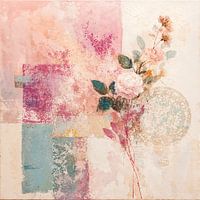 Een abstract collage waarin zachte pasteltinten van roze, turquoise en crème samenvloeien met delicate botanische elementen. De compositie toont rozen en bladeren in een etherische stijl, waarbij texturen en transparante lagen elkaar ontmoeten in een romantische, dromerige sfeer. De combinatie van geometrische vormen en organische…