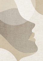 minimalistische en abstracte weergave van een zijprofiel, opgebouwd uit zachte, organische vormen. Het kleurenpalet, bestaande uit neutrale tinten zoals beige, taupe en wit, zorgt voor een rustige en harmonieuze uitstraling. De overlappende vlakken creëren een gevoel van diepte en zachtheid, terwijl de linnenachtige textuur een natuurlijke, warme dimensie toevoegt aan de compositie.