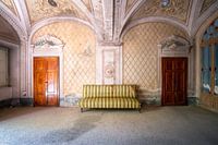 Een bank achtergelaten in een mooie verlaten villa. De villa was gevuld met antiek meubilair en omringd door veel vegetatie. Het zag eruit alsof een brand heeft gewoed in een van de kamers.