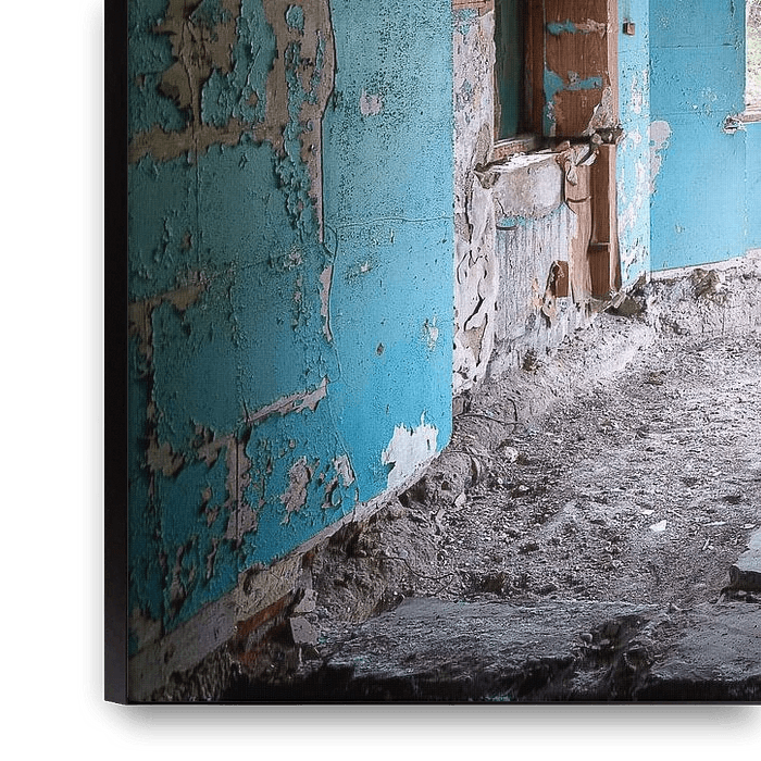Dit is een foto van een kleine blauwe kamer die ik gefotografeerd heb in een enorm verlaten sanatorium. Het dak geeft weer dat het pand voorzien is van een indrukwekkende architectuur.