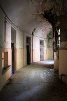 Dit is een foto van een verlaten gang in een ziekenhuis. De gang lijkt deuren te hebben van cellen, maar dat zijn het niet. Een deel van het ziekenhuis was nog in gebruik, maar dit deel was compleet verlaten en in hevig verval.