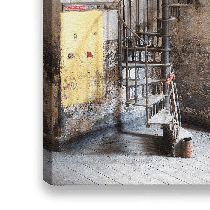 Dit is een foto van een prachtige verlaten metalen trap in een voormalige wolwasserij. De wolwasserij is al enkele jaren gesloten en machines worden door vrijwilligers gerenoveerd.