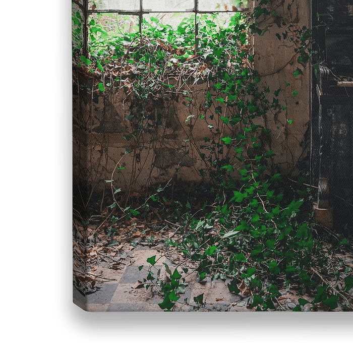 Een betoverend mooi tafereel uit een verlaten pottenbakkerij in België. Een oude piano staat naast een hoog boograam, waar klimop zich door gebarsten glas en versleten pleisterwerk weeft. Zacht natuurlijk licht filtert door de bladeren en combineert verval en vernieuwing in perfecte harmonie. Deze foto legt de stille poëzie vast van vergeten plekken, waar de natuur langzaam herwint wat ooit door mensenhanden werd gebouwd.