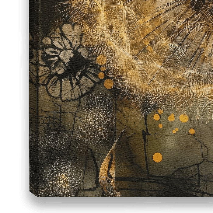 Het abstracte ontwerp is een meesterwerk van moderne kunst, met een heerlijke mix van gouden, bruine en zwarte tinten. Het midden van het schilderij wordt gedomineerd door een prachtige paardenbloem waarvan de bloemblaadjes helder goud zijn en glinsteren met een stralende gloed. Rondom de bloem baadt het schilderij in warme, rijke…