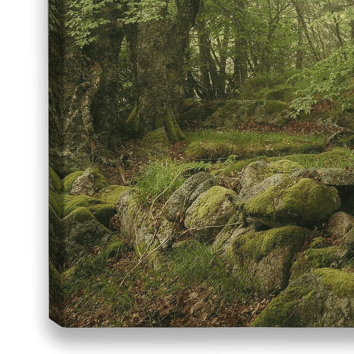 Schilderachtig tafereel van een sprookjesachtig bos in de bergen met bemoste rotsen, keien en kleine knoestige bomen op een nevelige lente ochtend. De steenblokken zijn eeuwen geleden door mensen geplaatst en de reden daarvoor is nog steeds onbekend, wat bijdraagt aan het mysterieuze gevoel van dit bos.