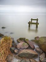 Overgebleven delen van wat ooit een steiger was in het Noord-Hollandse Markermeer. Op de voorgrond kleurrijke stenen. De lange belichtingstijd zorgt voor een fijne zachte sfeer.