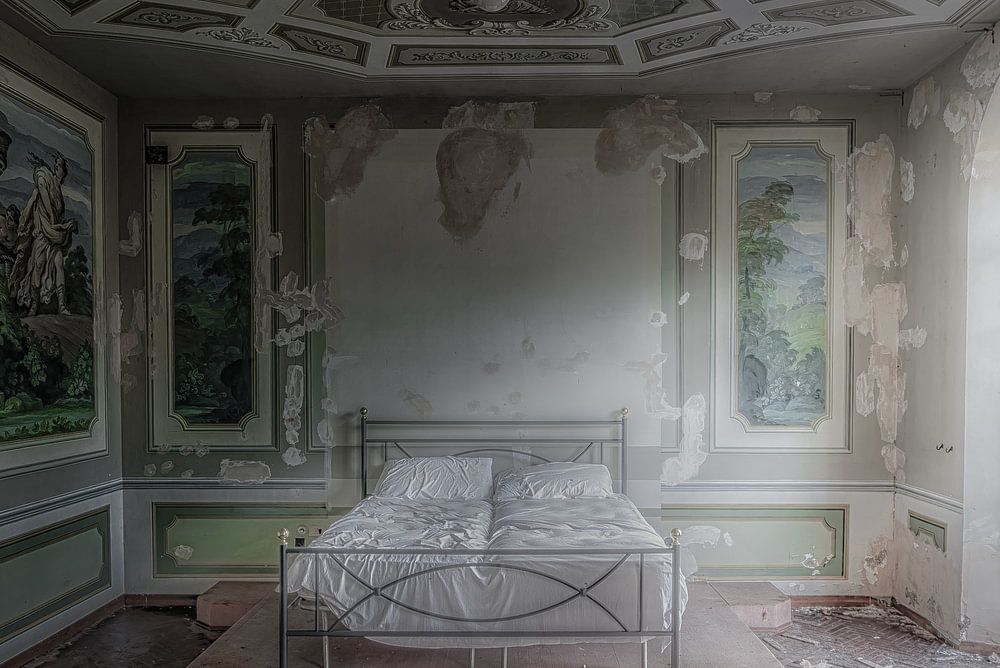 Oude slaapkamer in de ochtend waar het de eerste zonnestralen binnenvallen. De slaapkamer bevindt zich in een verlaten Italiaanse villa. De muren en het plafond zijn versierd met prachtige muurschilderingen.
