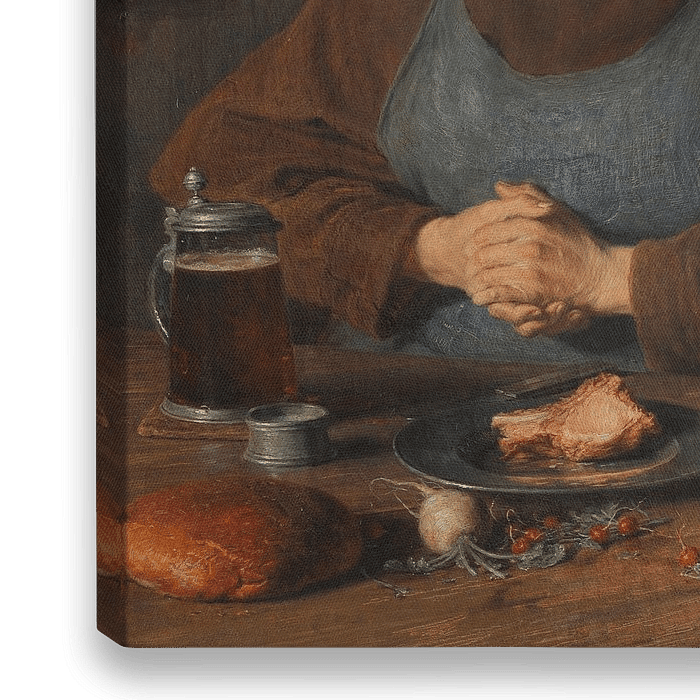 De monniken tonen duidelijk hun vreugde over de niet overdadige, maar overvloedige maaltijd, waarvoor uiteraard God te danken is. Onze monnik vouwde ook zijn handen in gebed in dankbaarheid, terwijl zijn tevreden blik rust op zijn maaltijd van een gekookt stuk vlees, een brood, zout, een paar radijsjes en een radijs. Een kroes…