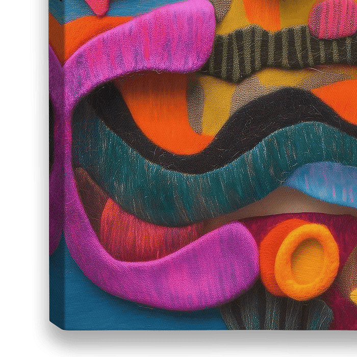 Kleurrijk abstract kunstwerk gemaakt uit wol met een 3d effect.