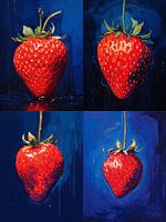 Vereniging van Smaak: deze digitale collage toont vier aardbeien in diverse kunststijlen, dansend op een diepblauwe achtergrond. Een harmonie van smaak en creativiteit.