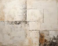 Vierkanten | Whispered Solitude - Dit abstracte schilderij toont een arrangement van gevlekte rechthoeken en vierkanten in overwegend beige en witte tinten, met subtiele accenten van grijze en bruine verweerde textures.