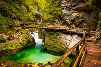 Houten vlonder door de Vintgar Gorge kloof met een brug over het smaragdgroene water van het stroompje vlakbij Bled in de herfst in Slovenië.