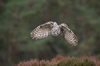 Virginia-Uhu ( Bubo virginianus ) in kraftvollem Flug, jagt auf einer Lichtung, im Hintergund ist der Waldrand zu sehen, frontale Aufnahme, amerikanischer Uhu