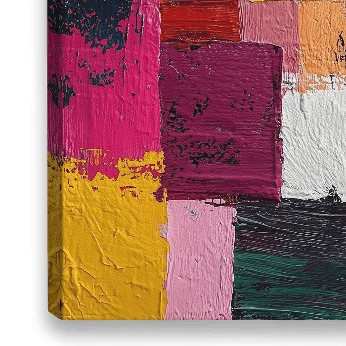 Een levendig abstract schilderij opgebouwd uit rechthoekige blokken en gestructureerde impasto verf. De compositie is een dynamische rangschikking van deze kleurblokken, die elkaar overlappen en naast elkaar geplaatst worden, wat een levendige en energieke visuele ervaring creëert. De algehele indruk is er een van vrolijke expressieve…