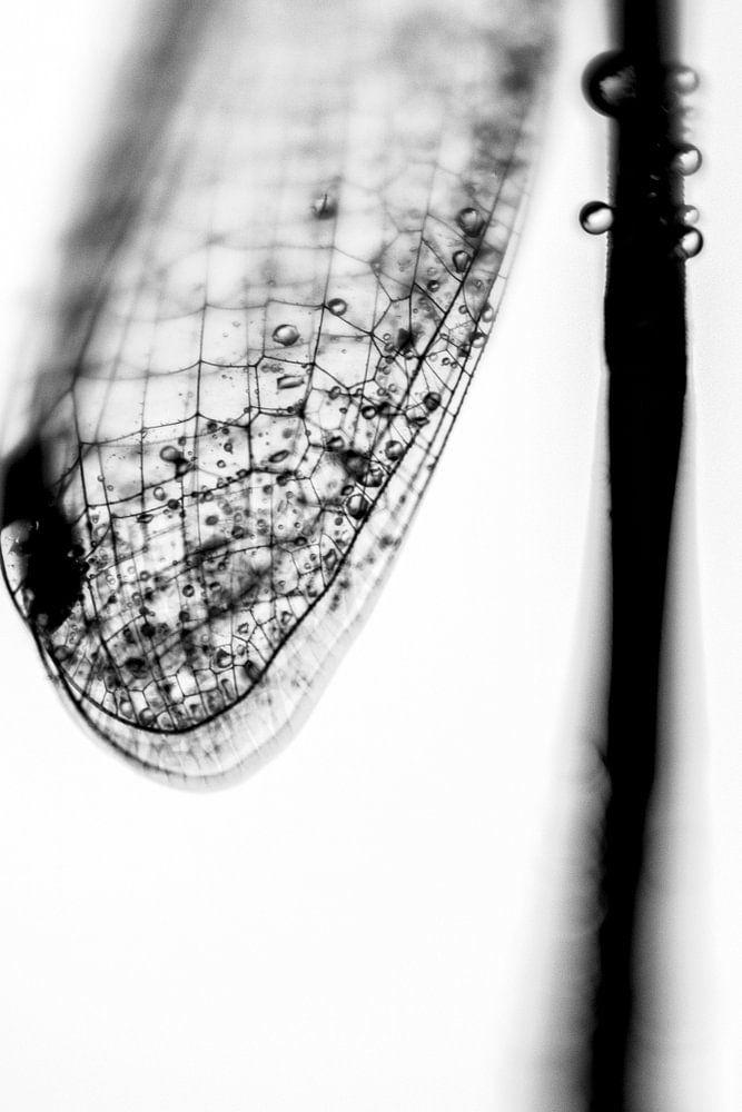 Vleugels van een libel met dauwdruppels. Foto in zwart/wit.