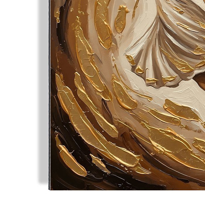 Fantasie kunst in goud kleur. Een vlinder fee met gouden vleugels vliegt naar de hemel. Kunstwerk in olieverf stijl. Gemaakt met AI op basis van een handgetekende houtskool tekening.