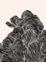 Een abstracte zwart-wit illustratie met vloeiende, golvende lijnen die een gevoel van beweging en diepte creëren. Perfect voor moderne interieurs