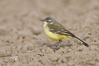 Een weide kwikstaart zit op een vers bewerkt veld. Zijn gele borst glanst in prachtig contrast met de omgeving.