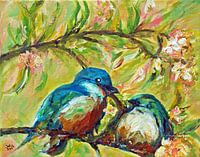 Olieverf schilderij van twee vogels op een tak met roze bloesem. De blauwe vogels kwetteren er lustig op los. Hun veren schitteren in verschillende kleuren blauw en groen in het zonlicht. De roze witte bloesemblaadjes zijn dik geschilderd zodat ze er uitspringen.