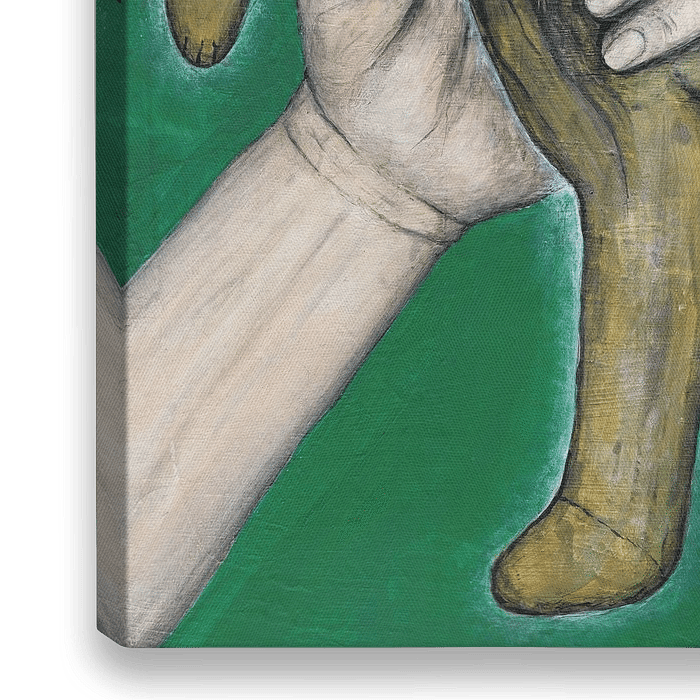 Een acrylverf schilderij van een voodoo pop die wordt fijngeknepen door een mensenhand.