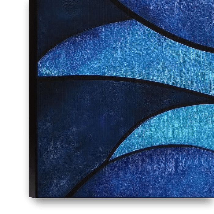 Deze vormen en golven modern blauw schilderij is een verfijnd en eigentijds kunstwerk dat rust en beweging op een harmonieuze manier samenbrengt. Dit ontwerp combineert vloeiende lijnen met abstracte vormen in verschillende schakeringen blauw, wat zorgt voor een kalmerende, moderne uitstraling.