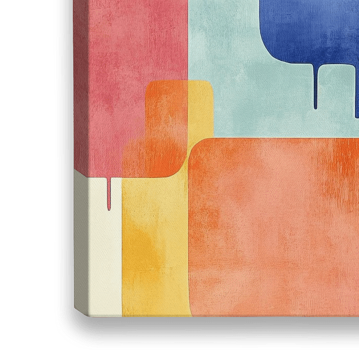 Vormenkunst | Moderne Vormen Collage - Dit abstracte schilderij bestaat uit overlappende en aan elkaar grenzende rechthoekige en wat afgeronde vormen in zachte pasteltinten en diepe kleuren zoals blauw en oranje, wat een gevoel van rustige, georganiseerde chaos geeft.