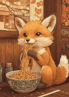 Een schattige vos zit aan een houten tafel in een traditioneel ingerichte woonkamer en geniet van een grote kom dampende ramen. De warme bruine tinten van de houten lambrisering en de gedetailleerde patronen op de muur en de keramische kom creëren een gezellige sfeer. De vos houdt de noedels met één poot vast terwijl de lange noedels…