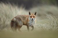 Een vos in een prachtige setting tussen het gras en dit zorgt voor een mooie zachte omlijsting.