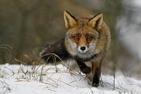 Een vos loopt door de vers gevallen sneeuw in de winter.