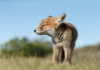 Een jonge vossen welp die op deze manier wel groot lijkt. Het lage standpunt zorgt voor dit beeld.