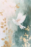 Vredesduif | Golden Flight - Dit vogel schilderij toont een vredige, vliegende witte duif met gespreide vleugels, geaccentueerd door gouden bladeren tegen een zacht getextureerde achtergrond van pastelgroen en blauw.