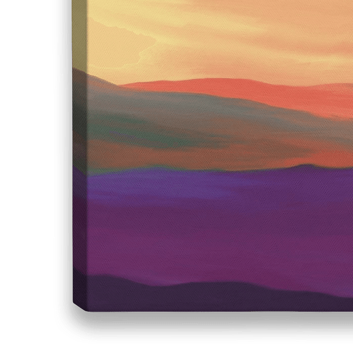 Schilderij van een vredig landschap met bergen bij zonsopkomst in mysterieuze, bijna surreal kleuren paars, geel en oranje.