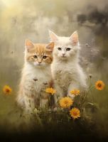 Deze charmante afbeelding toont twee jonge kittens, één met een warme oranje vacht en de andere met een lichtere, bijna witte tint. Samen zitten ze tussen een vrolijke verzameling gele bloemen, die de scène een zomerse en speelse sfeer geven. De kittens kijken met grote, nieuwsgierige ogen in de richting van de kijker, hun pluizige…