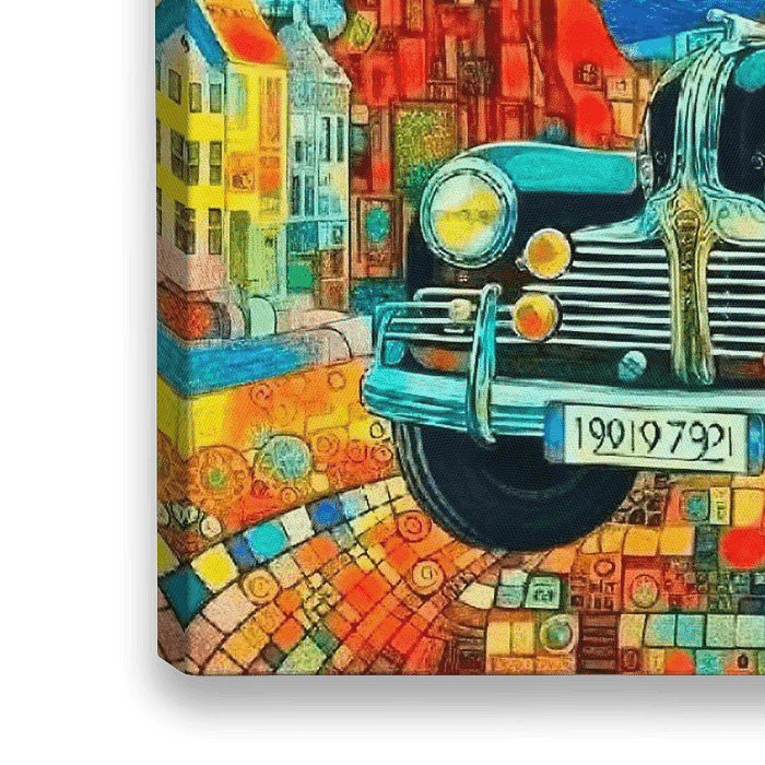 Koop dit digital art kunstwerk Vrolijke gekleurde auto geïnspireerd door Gustav Klimt en van Gogh.( 1 ) van Ineke de Rijk als reproductie op canvas, aluminium dibond, (ingelijste) fotoprint, behang en ArtFrame, op maat geprint in Fine-Art kwaliteit.