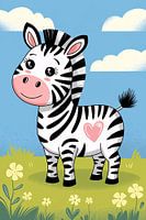 Deze vrolijke en kleurrijke illustratie toont een schattige zebra met een hartvormige vlek op zijn lichaam. De zebra heeft grote, stralende ogen en een brede glimlach, wat hem een vriendelijke en charmante uitstraling geeft. De achtergrond is eenvoudig maar effectief, met een blauwe lucht en een grasveld vol bloemen, wat een speelse en…