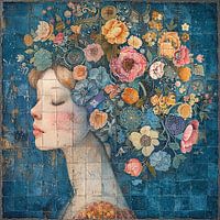 Over ‘Vrouw Bloemenportret | Dreamer's Floral Tapestry’ van Kunst Kriebels