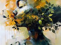 Vrouw Natuur - In dit abstract schilderij zie je een vrouwelijk profiel met bladeren die uit haar hoofd groeien, waardoor een verbinding tussen mens en natuur zichtbaar wordt, met warme kleuren zoals geel en groen.