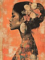 Vrouw Oorbel - Dit is een vrouwen schilderij van een zijaanzicht van een vrouw met grote bloem in haar haar en een opvallende oorring, geschilderd in een moderne mixed-media, licht gruizige stijl met warme aardetinten en goudachtige beige accenten, vrouwen schilderij, schilderij vrouw.