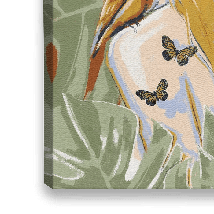 Kleurrijk beeld van een vrouw in de jungle met vlinders, monstera planten en een vogel op haar schouder.
