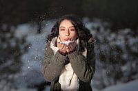 Deze sfeervolle foto toont een jonge vrouw met donkere, golvende haren die speels een handvol sneeuw in de lucht blaast. Haar gezicht straalt plezier en verwondering uit, terwijl kleine sneeuwvlokken om haar heen dwarrelen.