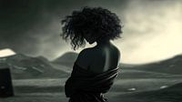 Een vrouw met krullend haar staat met haar rug naar de camera in een desolaat, monochroom landschap. Haar zwarte jurk wappert zachtjes in de wind, terwijl de kale omgeving een melancholische en peinzende sfeer creëert.